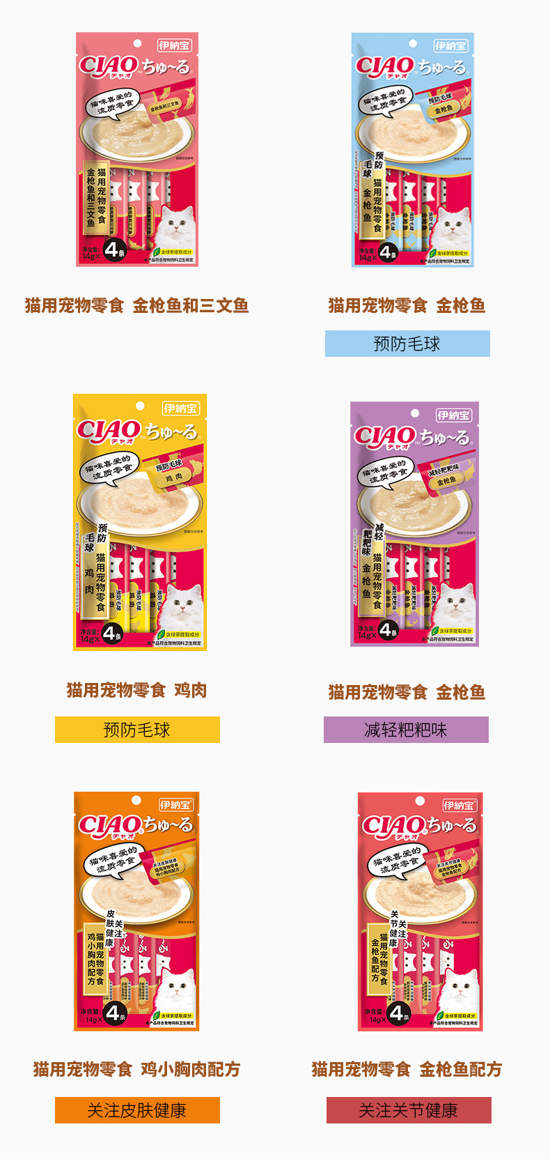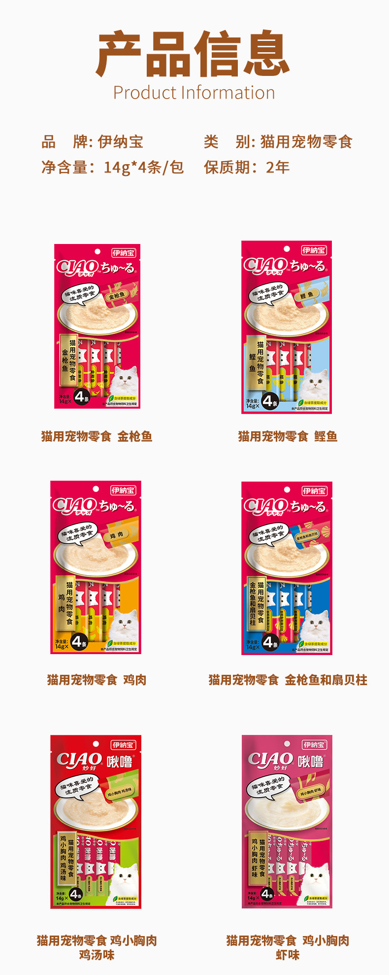 伊纳宝啾噜猫条猫咪零食湿粮Ciao金枪鱼味营养补水是一款专为猫咪设计的高品质宠物食品,旨在提供猫咪所需的营养和水分,特别适合那些挑食或者对湿粮有偏好的猫咪。您可以根据这一产品特点,满足市场上对健康、营养、且富含水分的猫咪食品的需求。以下是该产品的信息,供您参考: