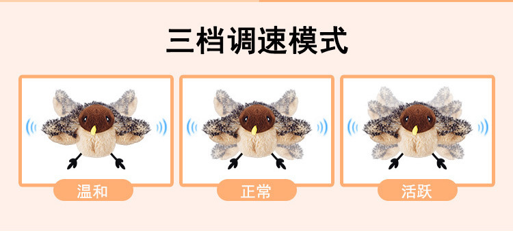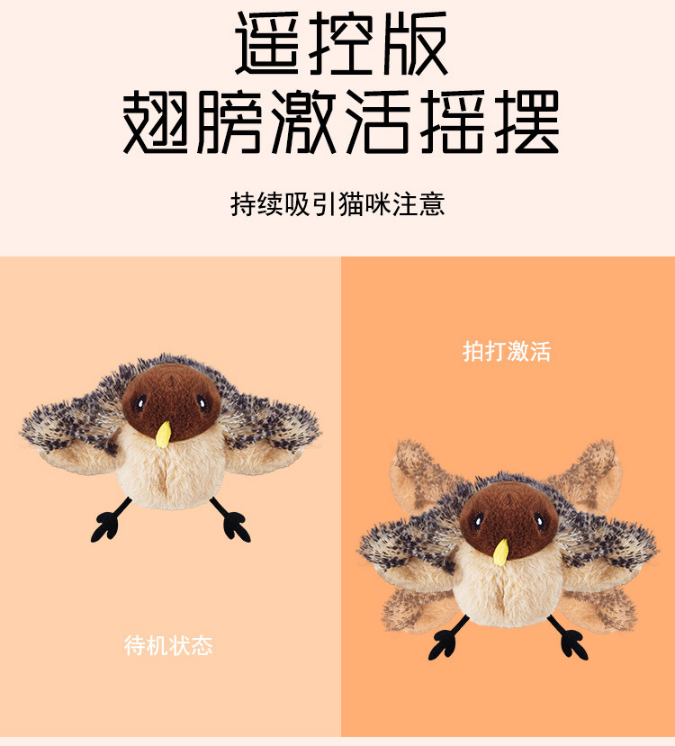 这款玩具采用高质量的毛绒面料,模*实小鸟的外形,色彩鲜艳且具备高度的*度,非常容易激起猫咪的猎食本能。玩具内部设计了触动感应功能,一旦猫咪接触到玩具,它就会发出声音,这样的设计不仅增加了猫咪的游戏乐趣,还能提高猫咪的活跃度。对于喜欢抓扑、跳跃的猫咪来说,这款逗猫棒玩具可以极大地激发它们的兴趣,并且帮助它们进行必要的运动,避免猫咪因缺乏活动而产生肥胖或其他健康问题。